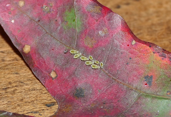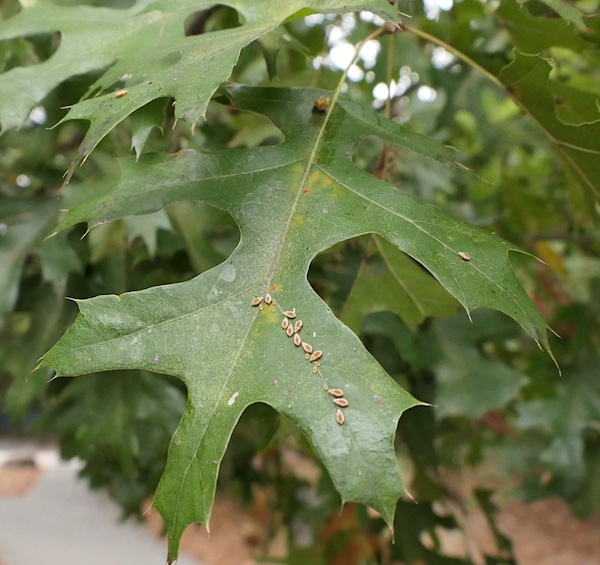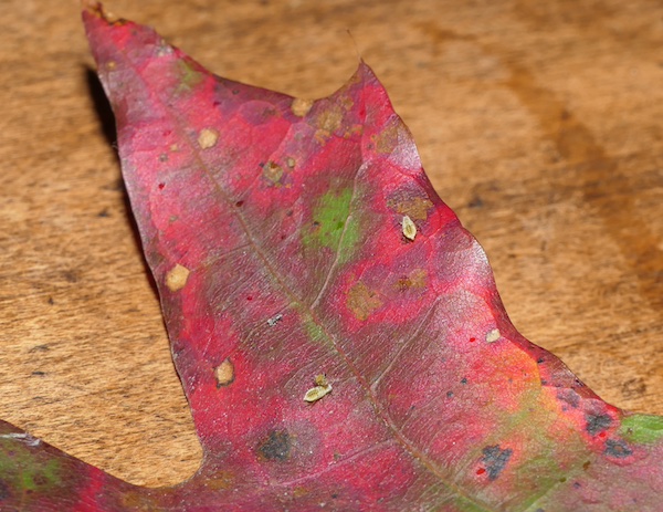 First half of October, a baker’s dozen of aphids on scarlet oak leaf (thirteenth on next lobe back).