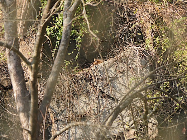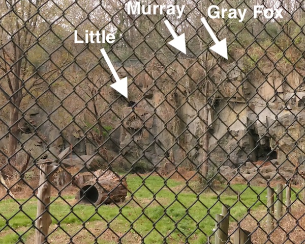 While watching Murray and Little, I noticed a movement on another ledge not far from Murray’s position. A quick shot with the zoom lens on my camera revealed a gray fox relaxed and resting out in the hazy sunshine.