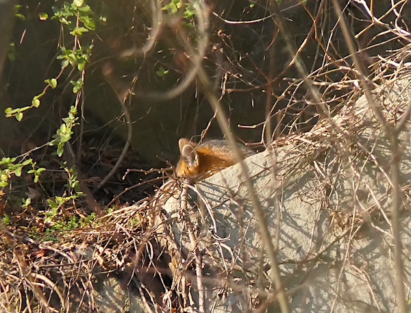 I was looking up to that area today to identify the ledge and saw an animal getting up, turning around and settling down again. It looked much larger than a fox though – longer legs and bigger body. The coloring was grey and reddish brown as the head in your picture. I’m thinking maybe it is a coyote?