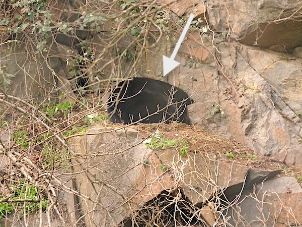Little bear appears to be a sound sleeper. Last winter she was out for the count, as I didn’t see her for long stretches at a time. She had found a nice quiet spot to be alone. It was in a depression, a hollow, in the rock wall close to the waterfall, out of the way of any bear traffic.