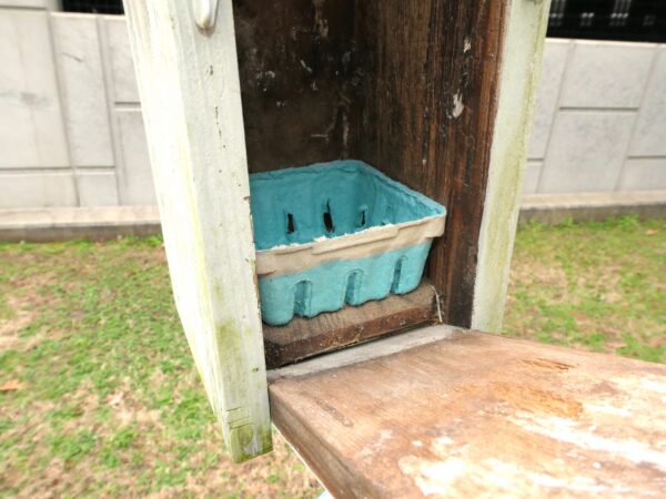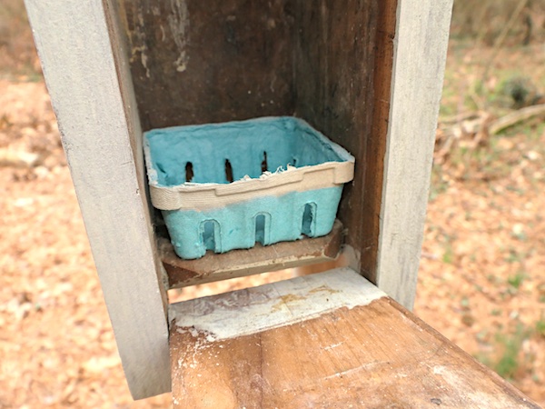 The nest box on the service road to Into the Mist has an empty berry basket inside.