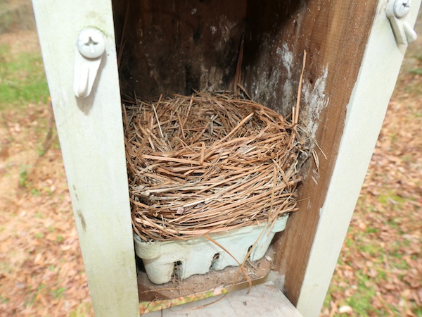 Not surprisingly, the nest box on the east side of the Parking Deck has within it a complete bluebird nest. The parking deck nest boxes are typically the first to see action.