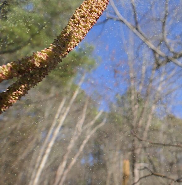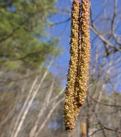 Hazel or common alder is in bloom and spreading pollen. If you wonder why you’re sniffling and sneezing while walking through Explore the Wild, the alder may be the reason. It’s growing on the north side of the wetlands.