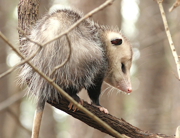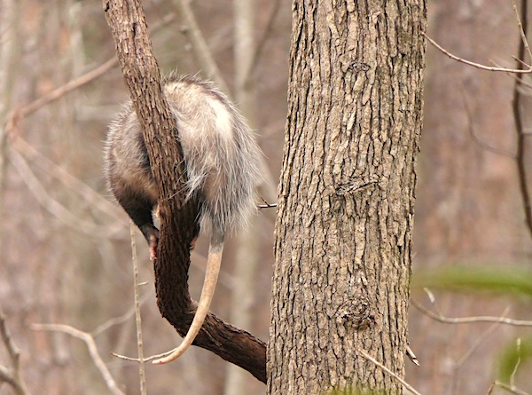 An opossum spent the entire day some twelve feet up a vine that wrapped itself around a tree next to the Dinosaur Trail. It’s not unusual to see these marsupials in trees (or vine as in this case). In fact, that’s where I most often see them, up in trees, that is, during daylight hours. Nocturnally, walking across a road or rummaging in a garbage can is the standard.