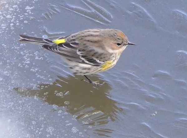 Top Photo: Yellow-rumped warbler forages on frozen pond ice.