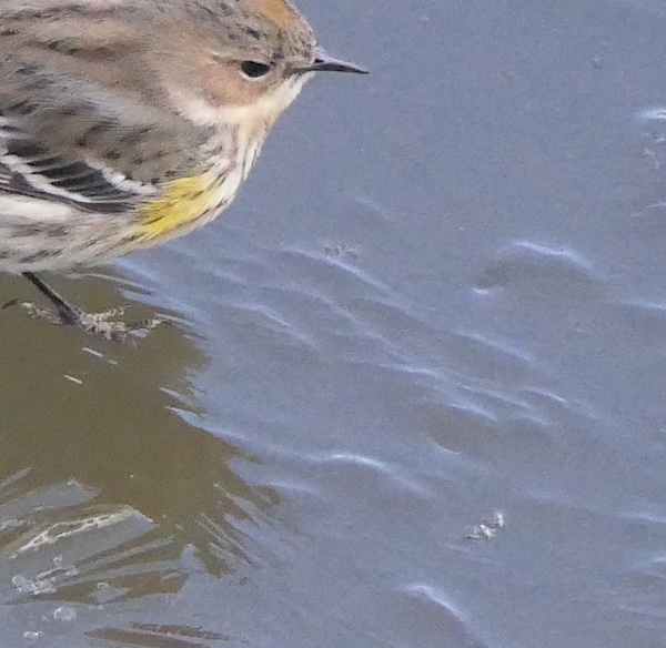 The birds below me seemed to be picking something from the ice. I took several images. When I got back to my office and downloaded the pics there appeared to be tiny white-colored insects in the water or on the thin ice of the ice star center. In the pictures below, note the warbler focusing on something in front of it.