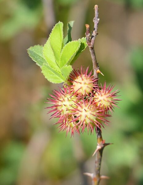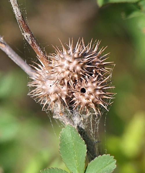 Swamp rose has acquired galls initiated by tiny wasps, spiny rose gall wasps (Diplolepis bicolor). The wasps lay eggs in the plant stem which stimulates the plant into growing the gall around the eggs protecting the wasp larvae within, and feeding them as well.