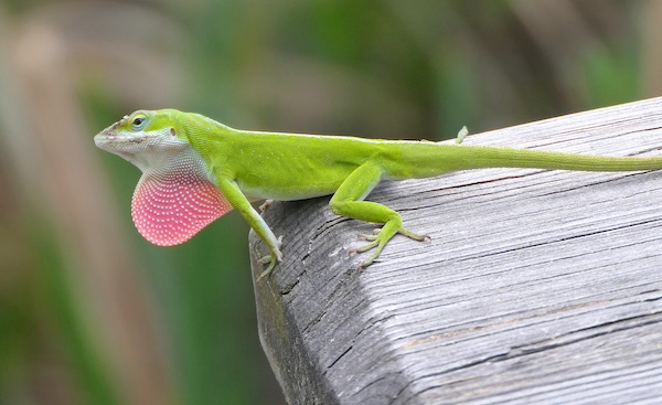 Green anoles have awakened to the spring. The big males are displaying their rosy dew lap.