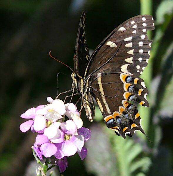 How do you know if what you’re looking at is a Palamedes swallowtail and not one of the other, much more common, large black swallowtails in the area? The Palamedes may look quite brown in good light or when faded by wear. It has a yellow stripe across the under surface of its hindwings. It also has yellow stripes on its abdomen. Most other black swallowtails have spots on their abdomens and lack the yellow stripes.