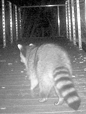 Exhibits Tech Dakota installed a camera in a heavily trafficked area. I decided to leave the camera up for a week and see what pops up. The camera was active each day during off hours, when the museum was closed to the public. After a few setbacks the camera worked fine and recorded raccoon after raccoon making its way across the walkway.