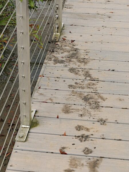 Lately there’s been a jumble of foot prints on the walkway due to low water and exposed mud. Each morning there’s a new set of very muddy tracks, multiple tracks, left behind by late night foraging animals. Foraging for tadpoles and juvenile frogs can be rewarding this time of year, especially with the water as low as it has been. The low water concentrates the tadpoles into ever shrinking pools of water, easy pickins.