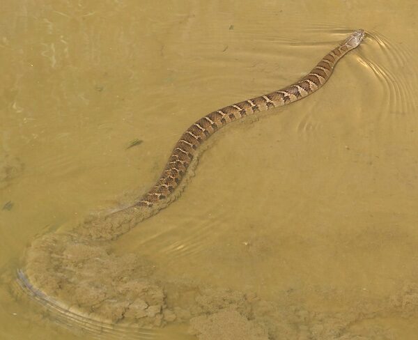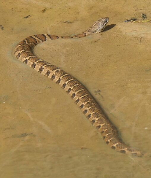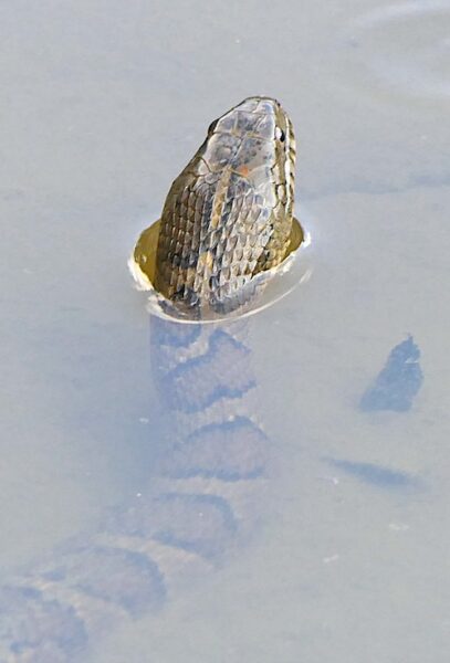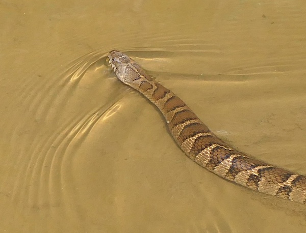 In the interest of identification, notice how the bands on the snake begin to break up about a quarter of the way down the body. This is an identifying characteristic of northern water snake. Banded water snakes have bands that are consistent the entire length of the body. They’re a coastal plain species and not likely to be seen here, but worth mentioning.